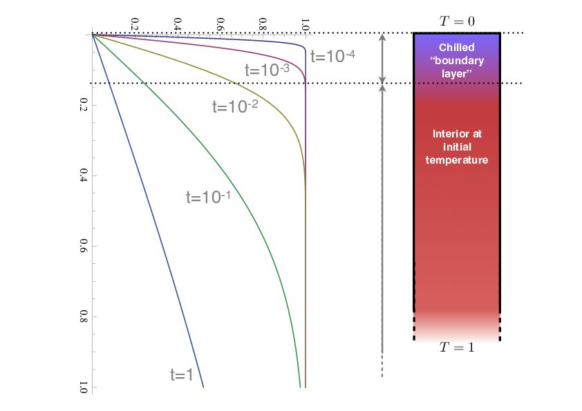 The standard solution is as follows. Assume a half-space at an intial temperature everywhere of \(T_0\) to which a boundary condition, \(T=T_s\) is applied at \(t=0,x_2=0\).