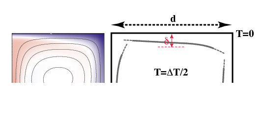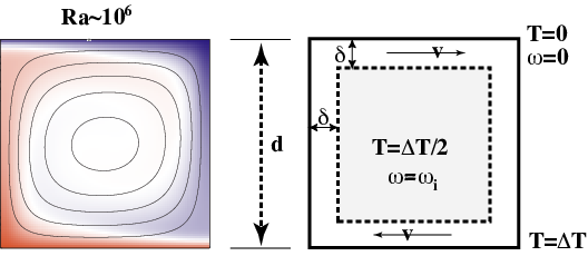 \[ \begin{aligned} \frac{\delta}{d} & \sim {\rm Ra}^{-1/3} \\ v & \sim \frac{\kappa}{d} {\rm Ra}^{2/3} \end{aligned} \]
