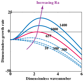 The absolute minimum value of \({\rm Ra}\) which produces growing perturbations is found by differentiating \({\rm Ra_0}\) with respect to \(k\) and setting equal to zero to find the extremum.
