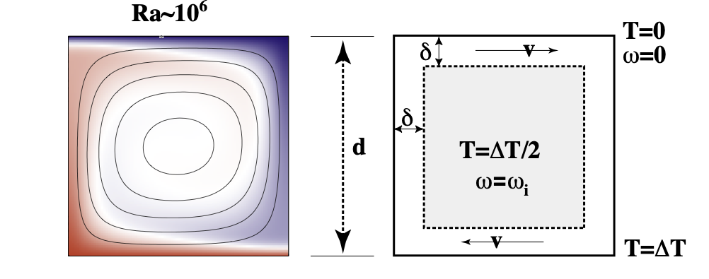 Blue is cool, red is warm. The bottom of the box is kept hot, the top cold and the difference in temperature is \(\Delta T\), the depth of the box is \(d\) and so on. These numbers are set up so that the Rayleigh number is the required value. In a lab experiment, the simplest parameter to change is \(\Delta T\) assuming that the material has a constant viscosity with \(T\) and does not freeze, melt, burn or boil.