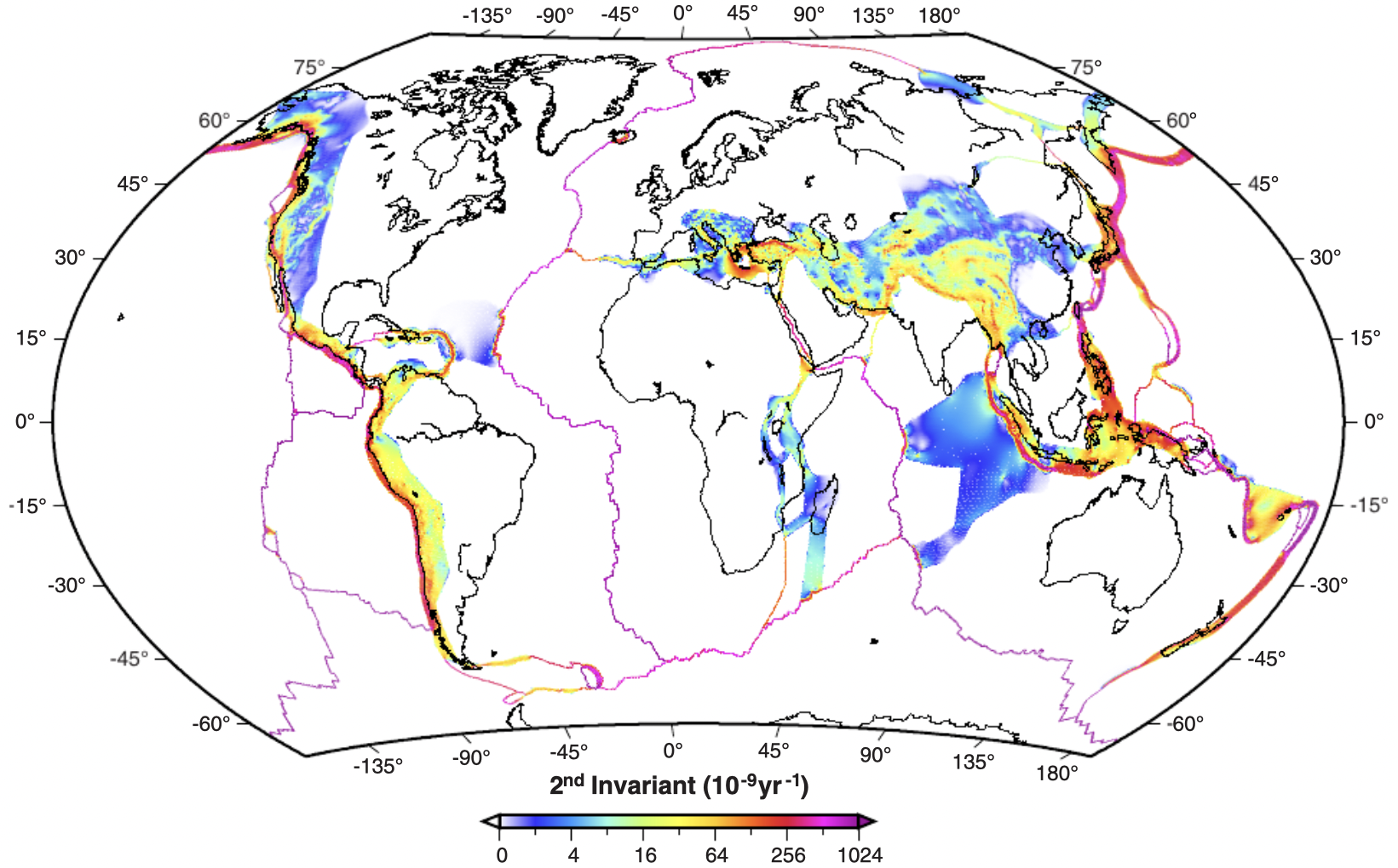 Directly observed plate motions (GPS, satellite ranging, very-long-baseline interferometry). Also shown, the strain-rate field, contoured to show highlight regions of high deformation rate.