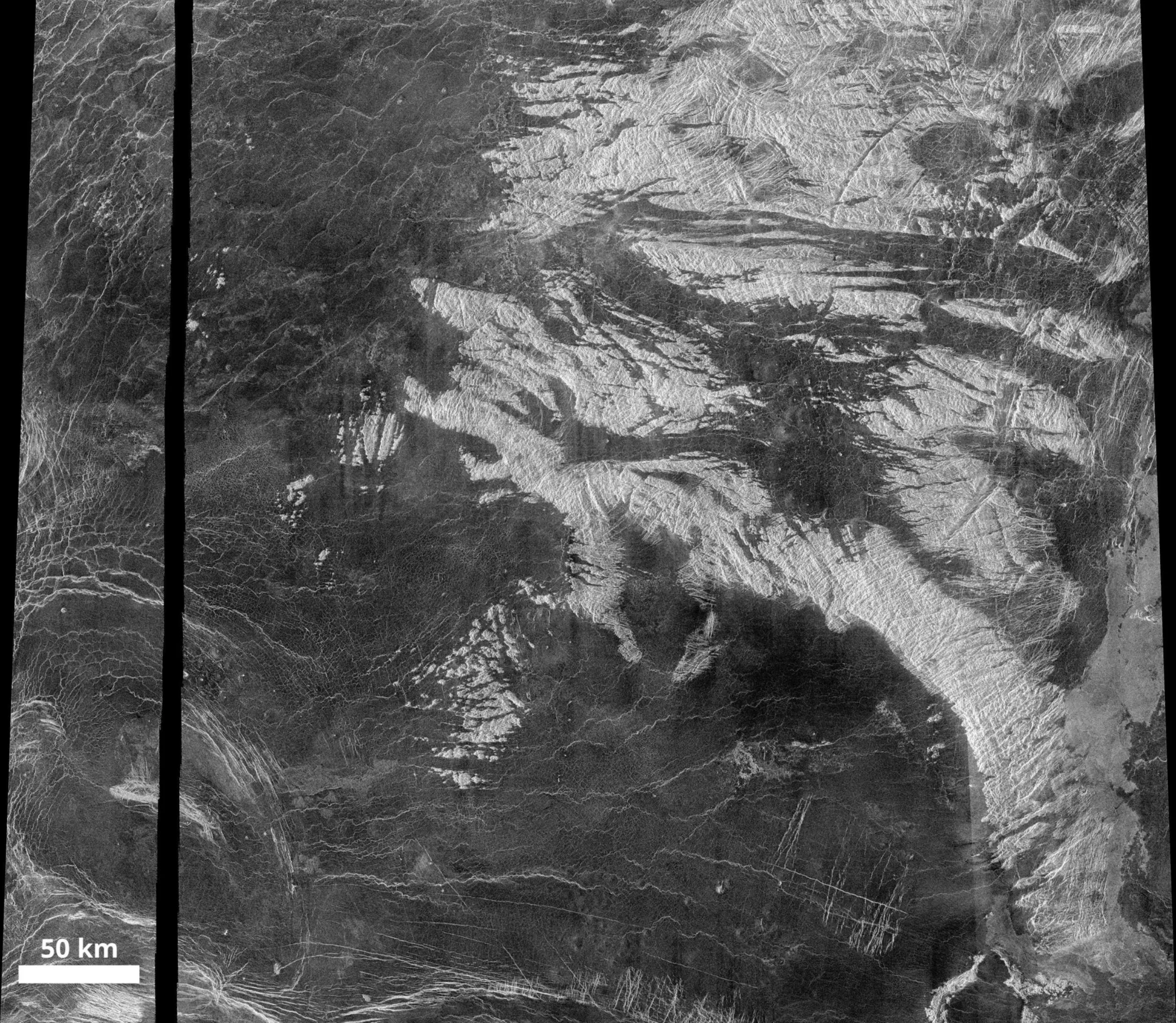 This is an area of Venus located southeast of Fortuna Tessera. The bright, rough terrain is “tessera”; the dark material between it is smoother lava plains. The plains are cut by polygonal cracks and folded by wrinkle ridges. Plains lavas have flowed into linear cracks in the tessera, indicating that the plains lavas came after the tessera.Image: NASA / JPL / mapaplanet.org / Emily Lakdawalla