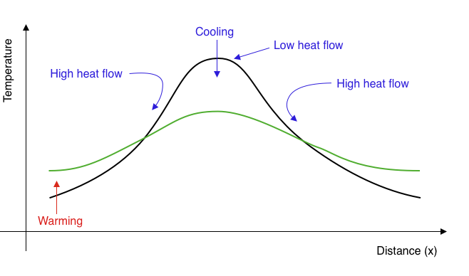 If the heat flux into a region is not balanced by the heat flux out, the region must change temperature. For example, if more heat flow into a region than is flowing out, it will become warmer.