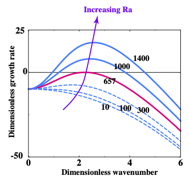 \[ \mathrm{Ra}_c = \frac{27}{4} \pi^4 = 657.51 \quad \textrm{and} \quad k = \frac{\pi}{\sqrt{2}} = 2.22 \]