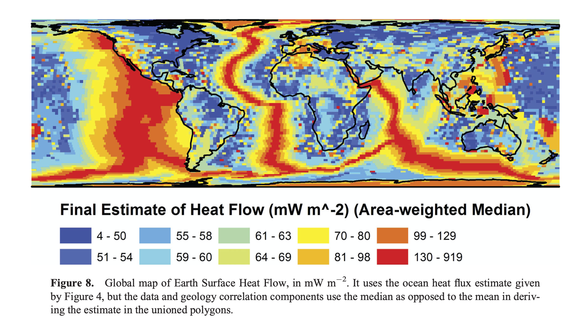 Global heat flow estimate by Davies & Davies 2013 which includes various geological assumptions for different types of heat flow province. **These are not raw / independent data because they use models to interpolate where data are scarce.