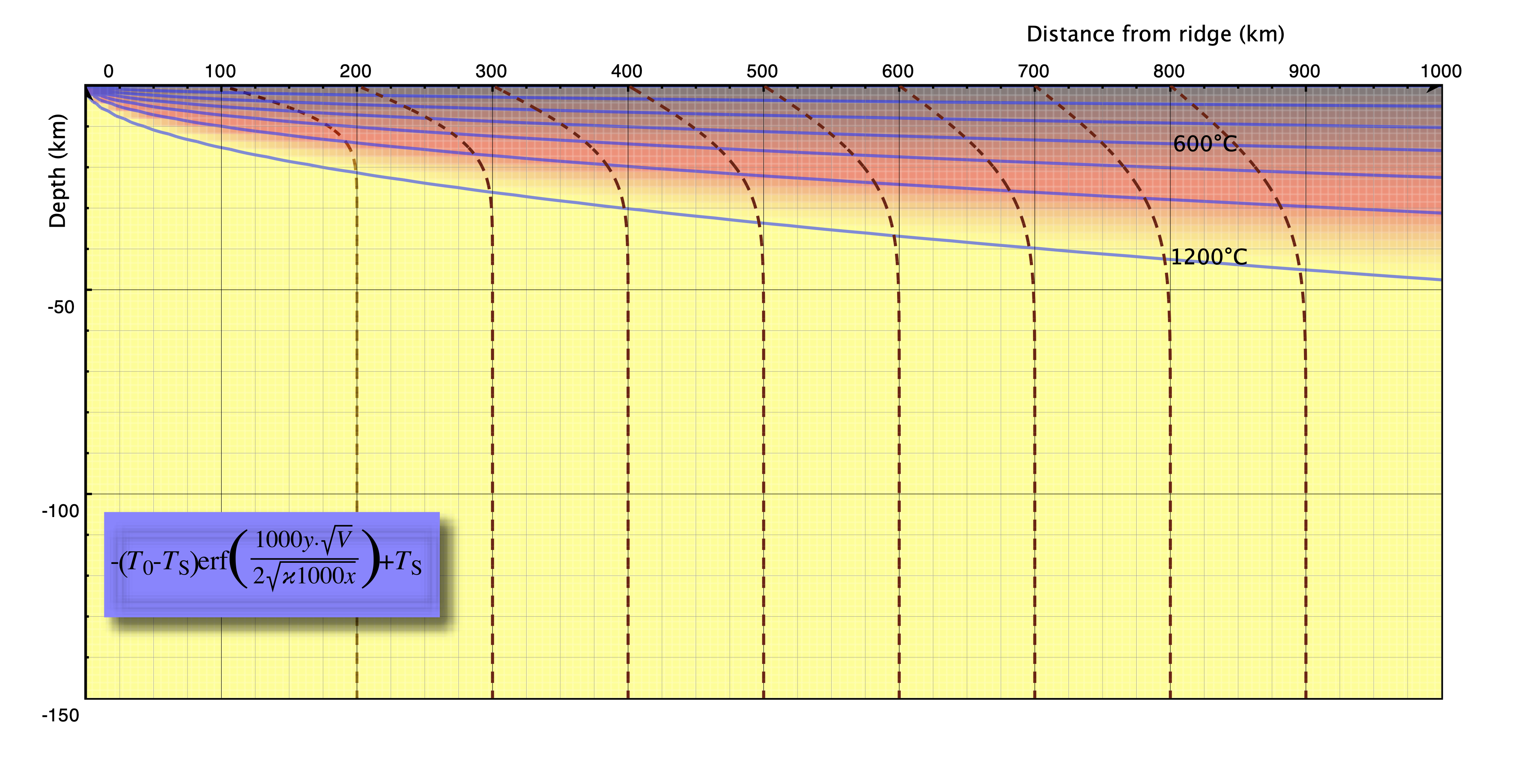 Lithosphere / boundary layer thickness — pick an isotherm and follow it from ridge to trench. Thickness \(\delta\) changes systematically: