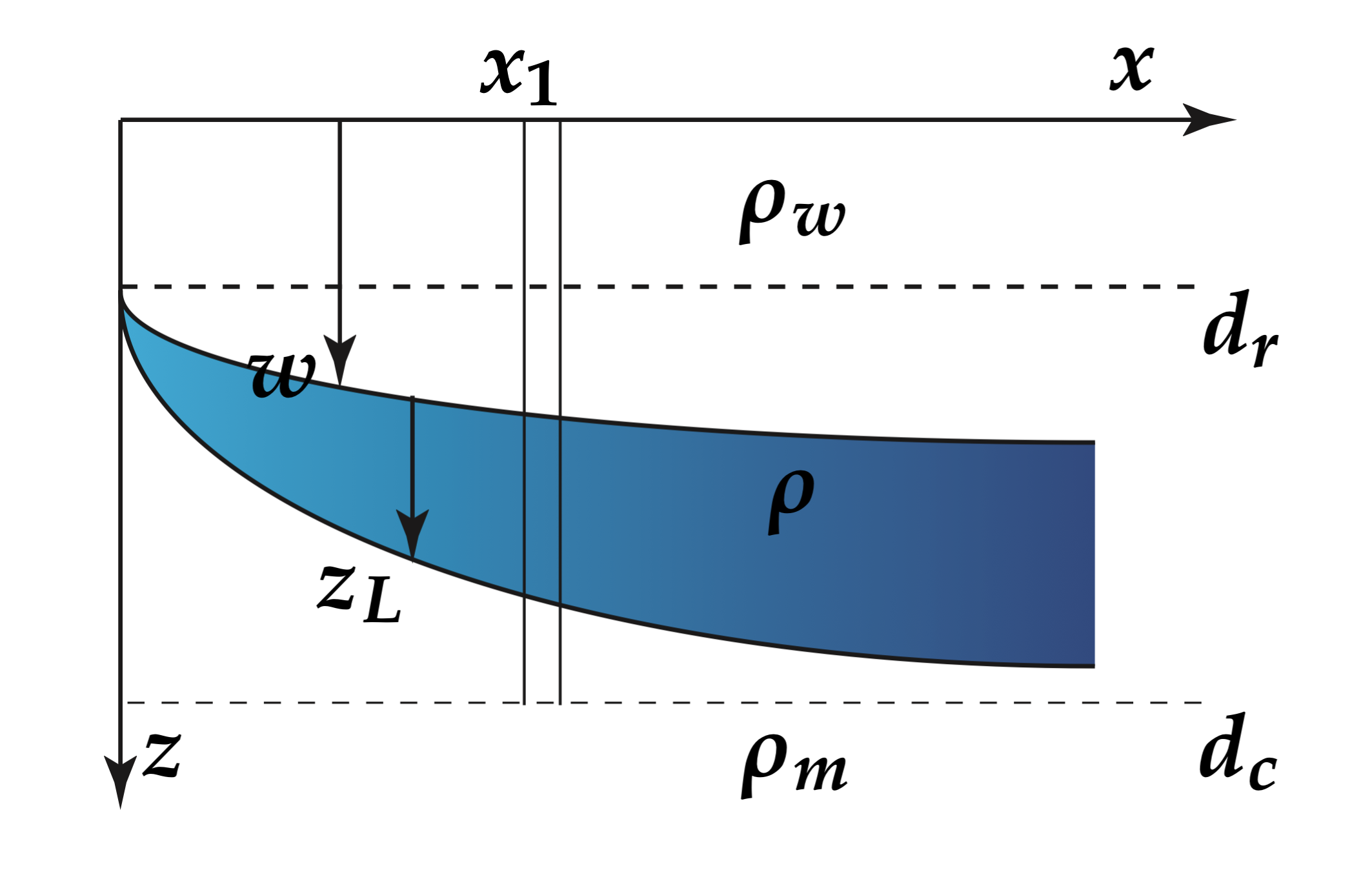 \[ w\left(\rho_w - \rho_m\right) + \int_{d_r}^{z_L}\left( \rho(z)-\rho_m\right) dz = 0 \]